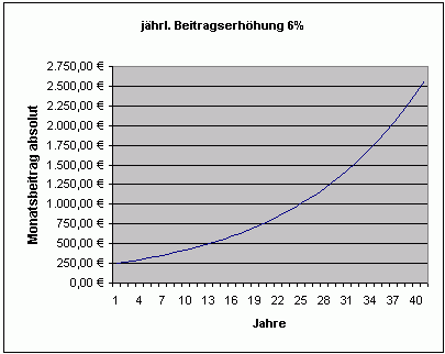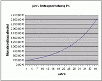 So führt eine Beitragserhöhung von "nur" 6% jährlich dazu, dass bereits nach 13 Jahren eine Beitragsverdoppelung eingetreten ist. Nach insgesamt 25 Jahren liegt man bereits über dem 4-fachen des Ausgangsbeitrages. Nach 40 Versicherungsjahren hätte man dann das 10-fache des Ausgangsbeitrages erreicht.